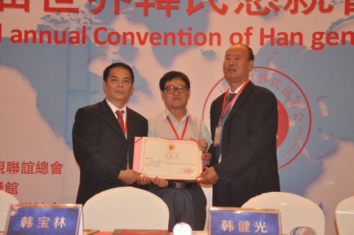 世界韩氏宗亲联谊总会会长韩健光(左)与联谊总会秘书长韩宝林共同为韩清涛(中)颁发“功勋奖”荣誉证书